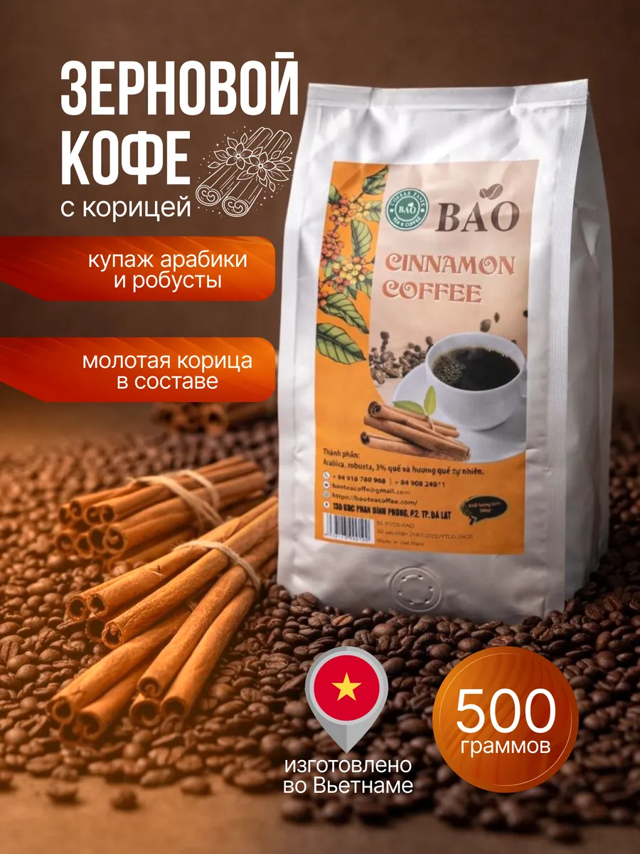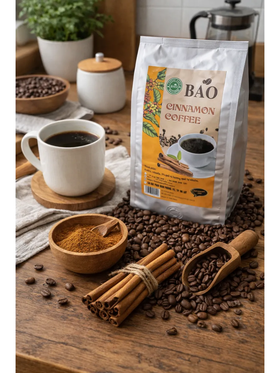 Кофе в зернах Bao Cinnamon - это ароматный вьетнамский кофе, который подарит вам бодрящее начало дня или приятный перерыв в течение дня. Смесь арабики и робусты с добавлением корицы создает уникальный, насыщенный вкус с нотками пряности. Средняя степень обжарки обеспечивает гармоничный баланс вкуса и аромата. Этот кофе идеально подходит для приготовления американо, эспрессо или других любимых кофейных напитков.